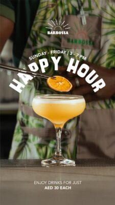 The best spot for sundowners with sweeping Yas Bay views. Enjoy the hottest happy hour at Barbossa with ice-cold drinks for just AED30. Start early, stay late, and let the good times pour.